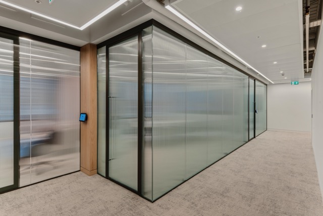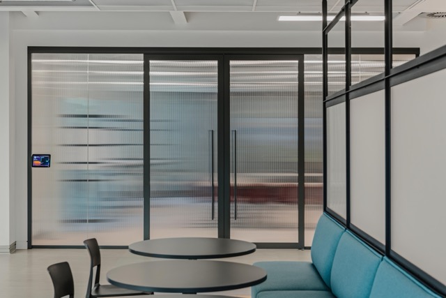 Front-of-house areas feature full-height reeded film for elegant privacy, whilst back-of-house spaces utilise frosted bands for a more functional approach. This dual strategy creates distinct zones whilst maintaining visual cohesion throughout the workspace.