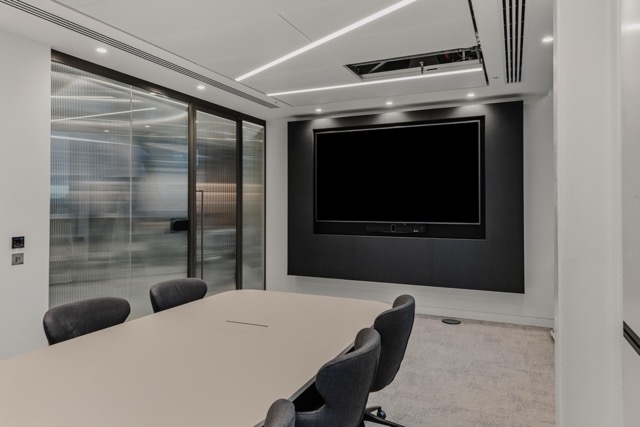 Room booking panels integrated directly into our glazing systems—a collaborative effort with Overbury that ensures technology enhances rather than disrupts the aesthetic. Clean lines, intuitive functionality, flawless execution.